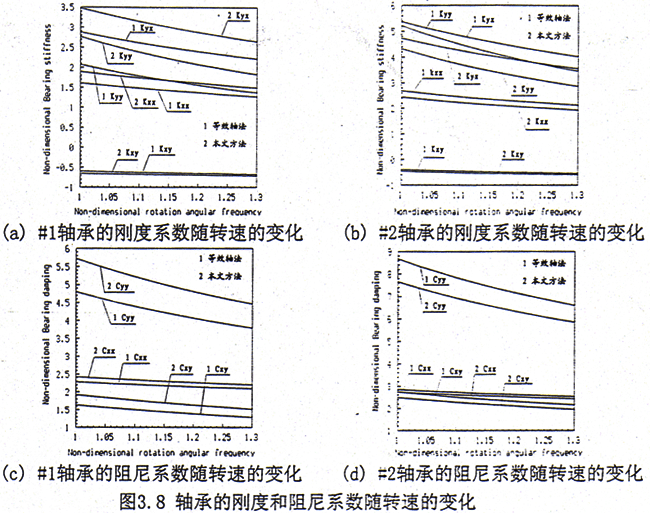 從以上的計算結(jié)果來看,用等效軸法計算軸承的軸心位置,#1軸承處的偏心率明顯偏小,偏位角偏大,而在#2軸承處則正相反。這表明采用等效軸法會使轉(zhuǎn)子的平衡位置產(chǎn)生較大的誤差,也預(yù)示著#1軸承和#2軸承之間負(fù)荷分配的變化。另外比較#1和#2軸承的結(jié)果,還可以看出,聯(lián)軸器的作用使得二個軸承的負(fù)荷分配趨于接近,而等效軸法從某種意義上講相當(dāng)于二個轉(zhuǎn)子的直接對接,必將造成二軸承負(fù)荷分配不均,在工作轉(zhuǎn)速下各軸承處的負(fù)荷分配見表3.2,因此對軸承的受力來說這也正是采用齒輪聯(lián)軸器的優(yōu)點(diǎn)所在。從二軸承處的動特性來看,#1軸承的各項剛度和阻尼系數(shù)比等效軸法大,而#2軸承的各項剛度和阻尼系數(shù)則比等效軸法小,這歸根到底也是軸承負(fù)荷分配發(fā)生了變化的結(jié)果。如果采用單軸分析方法計算,以左側(cè)轉(zhuǎn)子為例,由于聯(lián)軸器的質(zhì)量與圓盤相比要小許多,系統(tǒng)近似為一對稱轉(zhuǎn)子系統(tǒng),則作用在#1和#2軸承上的負(fù)荷相差不大,因此二個軸承處的動特性系數(shù)也比較接近。由于軸承的靜、動特性發(fā)生了變化,因此勢必引起系統(tǒng)動態(tài)特性的變化。