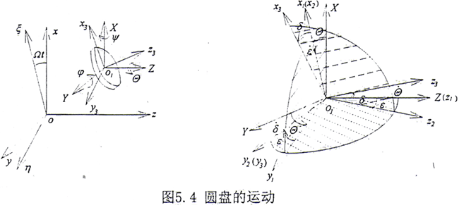 圓盤的運動可分解成隨其質心的平動和繞質心的轉動。質心o1的平動位移為(xc,yc),不計沿z軸方向的運動。圓盤繞質心的轉動可用三個歐拉角來表示,如圖5.4所示。設o1XYZ是與oxyz平行的坐標系。o1XYZ坐標系的單位矢量為