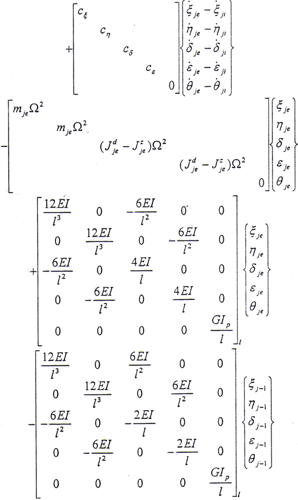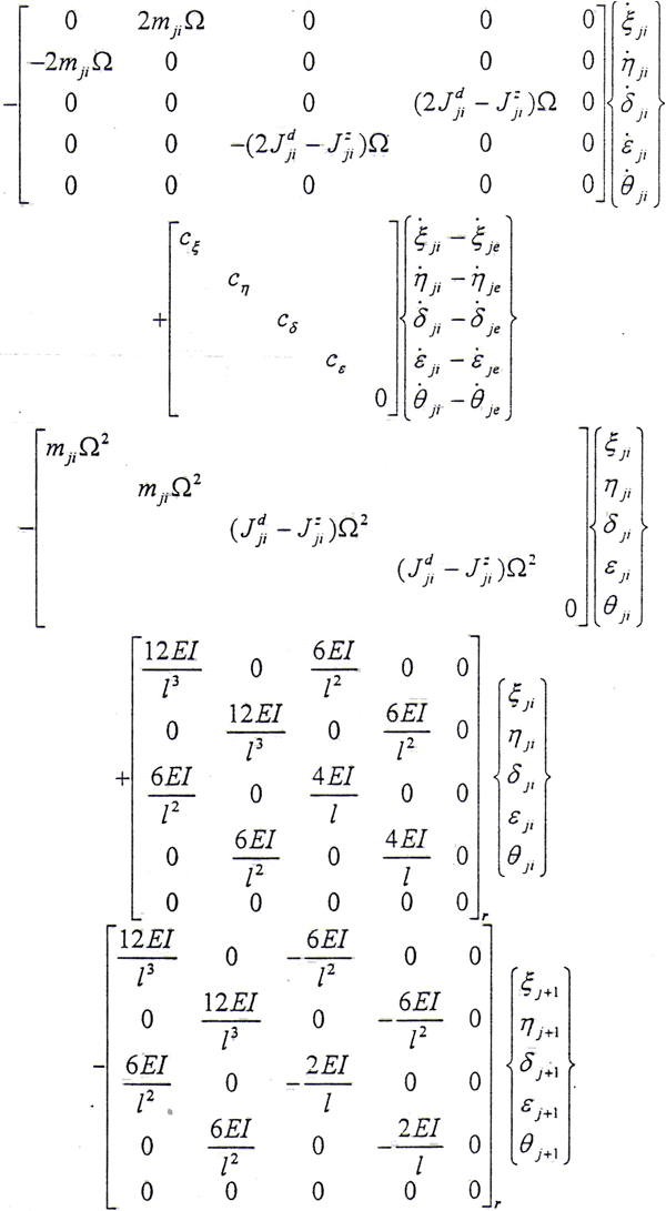 半齒輪聯(lián)軸器系統(tǒng)的動能包括內外齒輪的平動動能和轉動動能;彈性勢能包括左右軸段的彈性勢能和半齒輪聯(lián)軸器的彈性勢能;耗散函數包括內外齒輪之間的橫向內阻尼和轉角內阻尼,由于扭轉內阻尼較小可將其忽略,具體的分析過程可參見第三章3.2.2和3.2.3節(jié)。這樣取q=ξje,ηje,δje,εje,θje,ξji,ηji,δji,εji為廣義坐標,將以上的約束方程(5.26)式代入半齒輪聯(lián)軸器系統(tǒng)的動能,勢能及耗散函數中,消去多余的變量θji,再由拉格朗日方程就可以得到在齒輪嚙合處的運動微分方程。由于推導過程比較冗長,在此僅列出最終的運動微分方程。對于小偏離情況,將其中的高階小量略去,則對于第j個結點(其中外齒輪下標為e,內齒套下標為i)