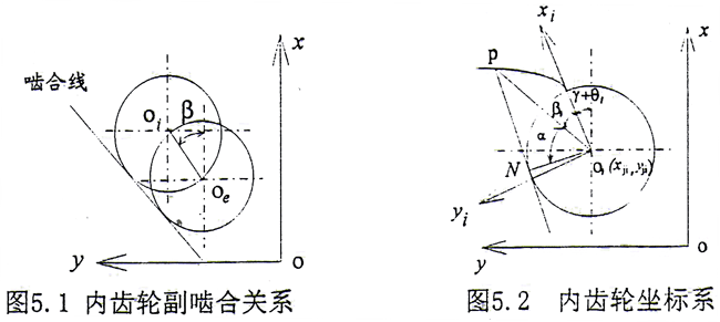 上式表明嚙合線與連心線是平行的,這一結論與文獻[100]相同,這從另一個側面驗證了(5.10)式、(5.11)式的正確性。以上的嚙合關系與外齒輪嚙合具有類似的形式,只不過在齒輪聯(lián)軸器中,內外齒輪的基圓半徑是相等的。由式(5.13)可以得
