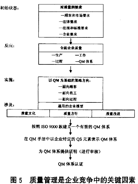 圖5 對本文所討論的企業(yè)競爭中的重要因素——質(zhì)量管理進行總結(jié)。出發(fā)點是對各個方面提出的質(zhì)量要求作詳細說明。為滿足質(zhì)量要求作出的反應(yīng),是提出全面企業(yè)質(zhì)量概念,這包括與產(chǎn)品、服務(wù)、過程和系統(tǒng)相關(guān)的質(zhì)量元素。